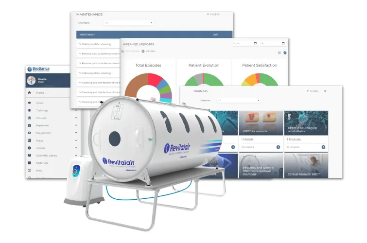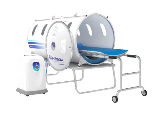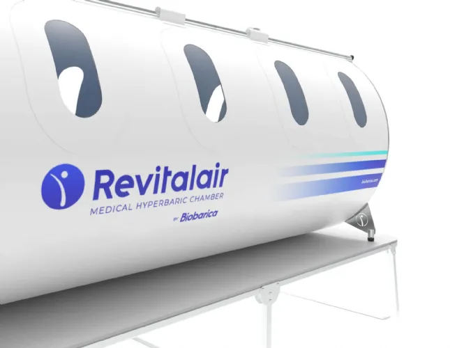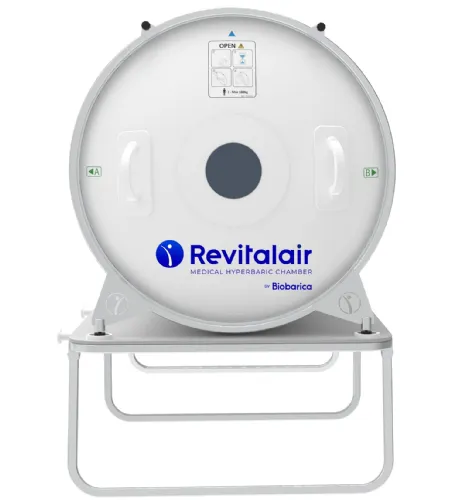 The Biobarica Revitalair® 430F is a monoplace hyperbaric chamber by Biobarica. It features exhaust valves set at 1.45 ATA and a calibrated relief valve in the compressor cabinet. Adhering to certified quality standards, its components include a 99 lbs cabinet, 64 lbs air compressor, 64 lbs support table, and an 88 lbs stretcher. Engineered to withstand pressures up to 1.45 ATA, it’s designed for precision and functionality.